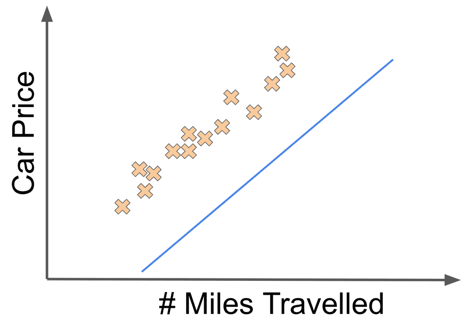 Imagine that you received a data set consisting of cars, where for each car you had the number of miles a car had driven along with its price. In this case, let’s assume that you are trying to train a machine learning system that takes in the information about each car, namely the number of miles driven along with its associated price.